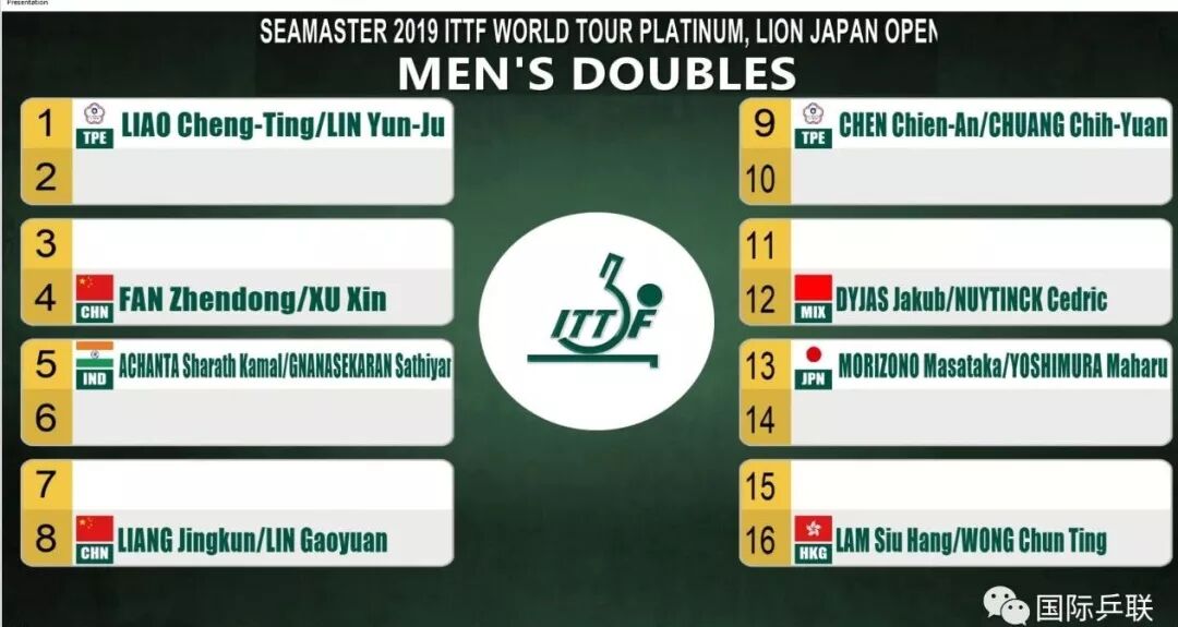男双种子签表 上半区:廖振珽/林昀儒(中华台北)、樊振东/许昕(中国)、阿昌塔/加纳纳塞卡然(印度)、 梁靖崑/林高远(中国)