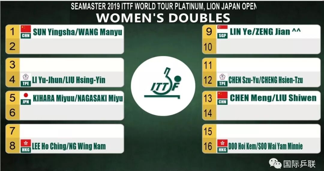 下半区:林叶/曾尖(新加坡)、陈思羽/郑先知(中华台北)、陈梦/刘诗雯(中国)、杜凯琹/苏慧音(中国香港)